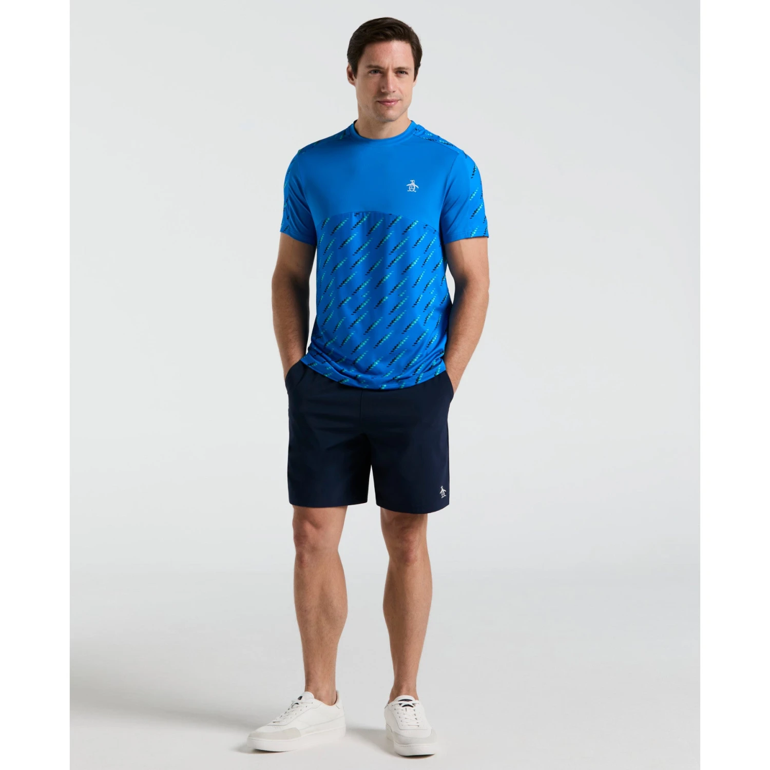 Dress for style and performance in this Original Penguin men’s tennis t-shirt. Single knit fabrication is lightweight, while added stretch delivers a comfortable fit with optimal flex. Moisture-wicking properties ensure you feel dry, set after set. A classic crew neck and tennis-themed design make this tennis shirt a cut above.