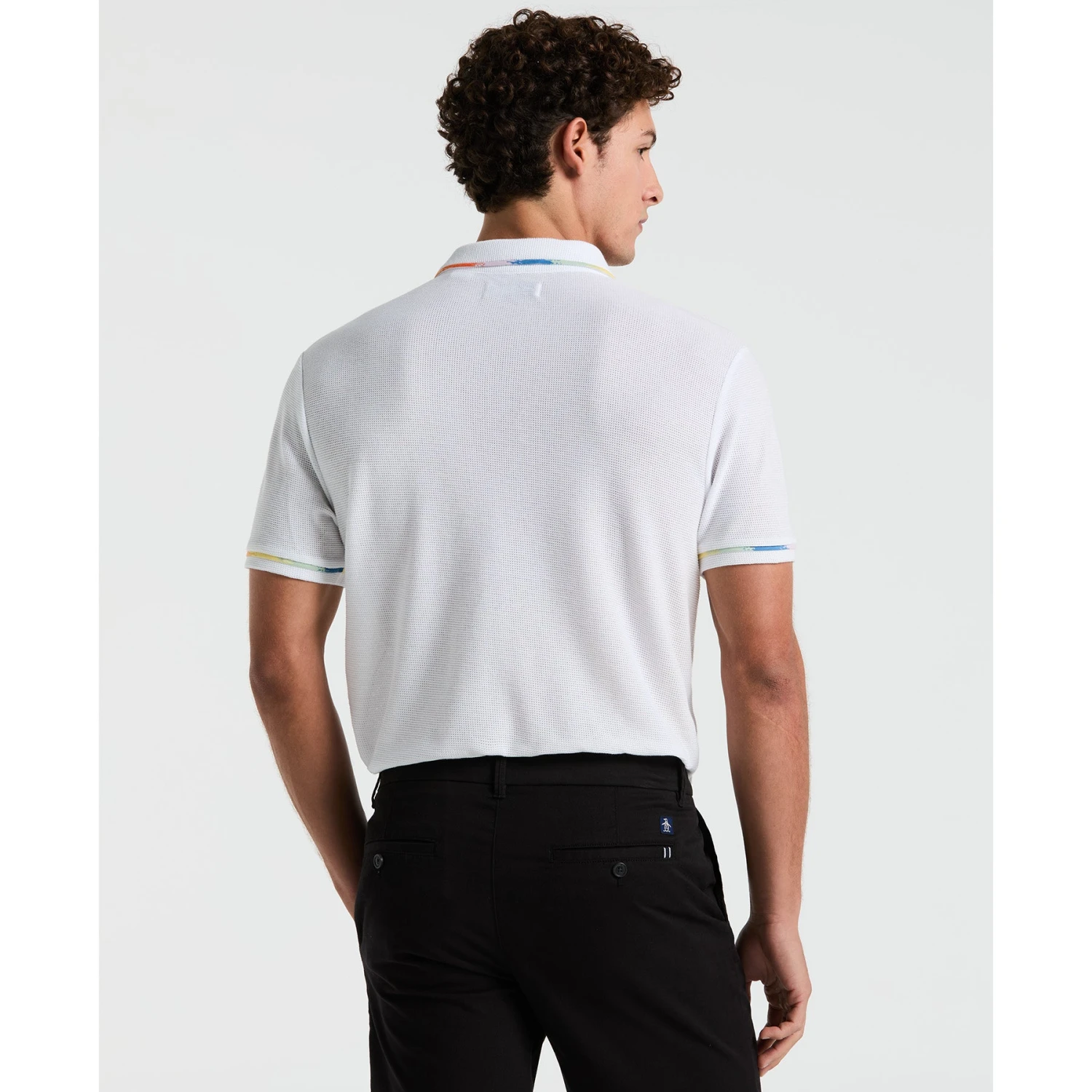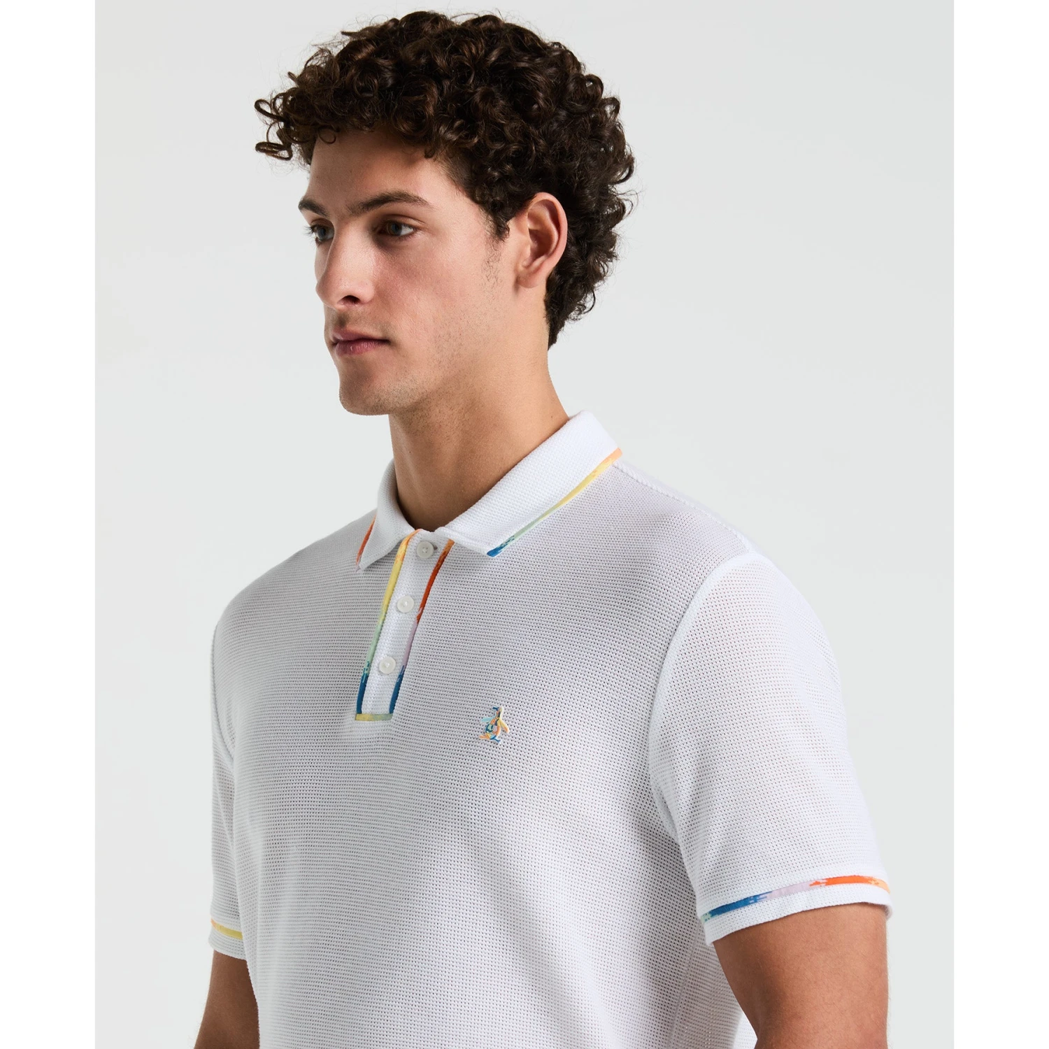 Stay the fashionable life of the party at your next Pride celebration with this men’s polo from Original Penguin. Featuring rainbow tipping for a touch of festive style, this polo shirt for men also has a classic design that gives your casual wear a polished touch. The cotton mesh fabric helps you feel cool and comfortable through all-day wear.